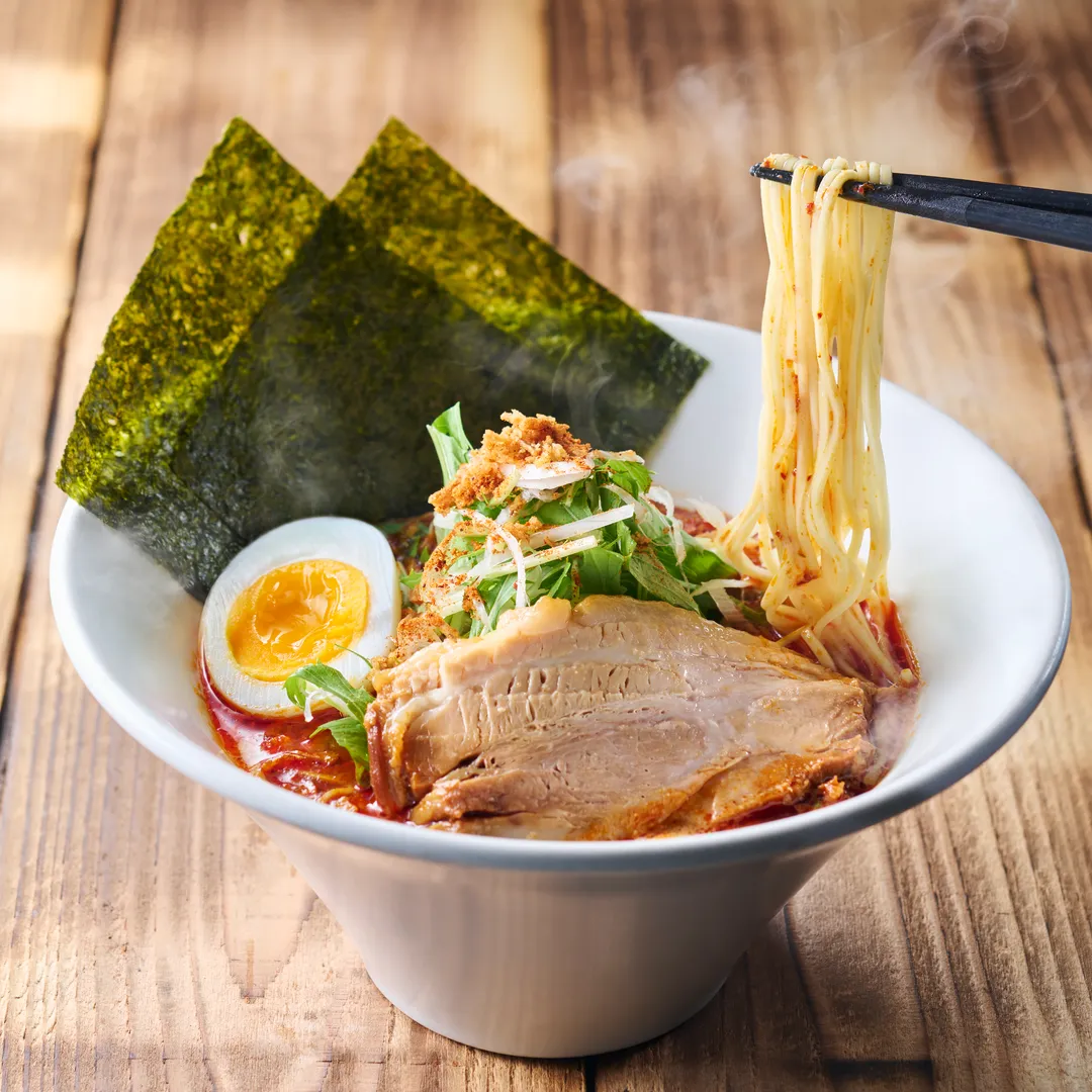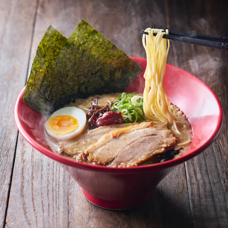 スープ(ポークエキス、醸造酢、豚脂、食塩、砂糖、にんにくペースト、食用風味油、しょうゆ加工品、しょうがペースト/調味料(アミノ酸等)、増粘多糖類、香料、酸化防止剤(V.E)、香辛料抽出物