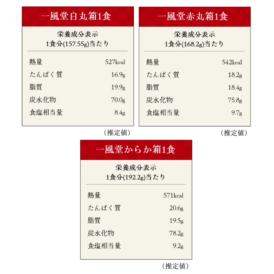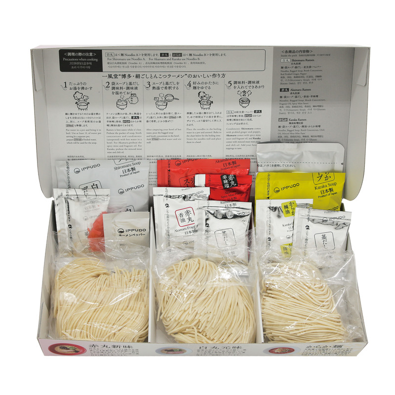 まずはこれ!一風堂を代表する白丸・赤丸・からかを揃えた一風堂を代表するラーメンの3食セットです。