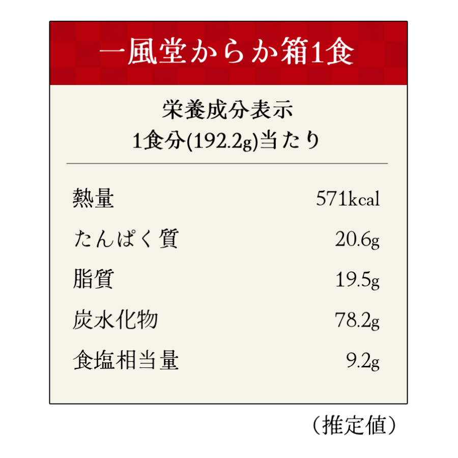 スープ(ポークエキス、醸造酢、豚脂、食塩、砂糖、にんにくペースト、食用風味油、しょうゆ加工品、しょうがペースト/調味料(アミノ酸等)、増粘多糖類、香料、酸化防止剤(V.E)、香辛料抽出物