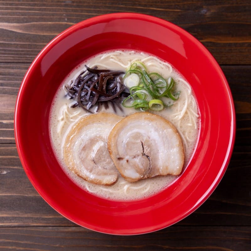 ギトギトの赤ではないんですね。きっと白い豚骨スープが映えるように計算してちょっと朱色気味の色味なんだと思います。