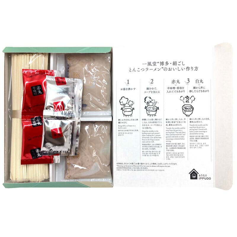 「香油」と「辛味噌」を2袋ずつ添付し、「白丸」「赤丸」どちらでもお召し上がりいただけます。