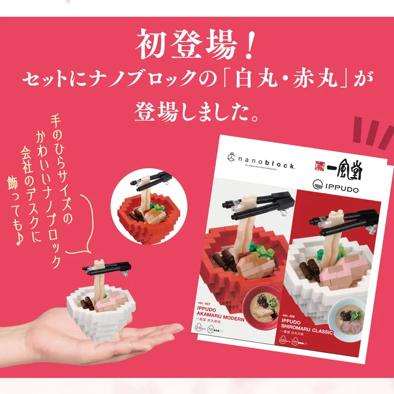 一風堂の代表するとんこつラーメンがナノブロックになって登場! クリアパーツを使用して再現したとんこつスープやトッピング、一風堂を象徴する丼まで細部に再現しました。 一風堂ロゴの看板も付いて、インテリアとしてもオススメです。― 原点の一杯 とんこつラーメン白丸 ―