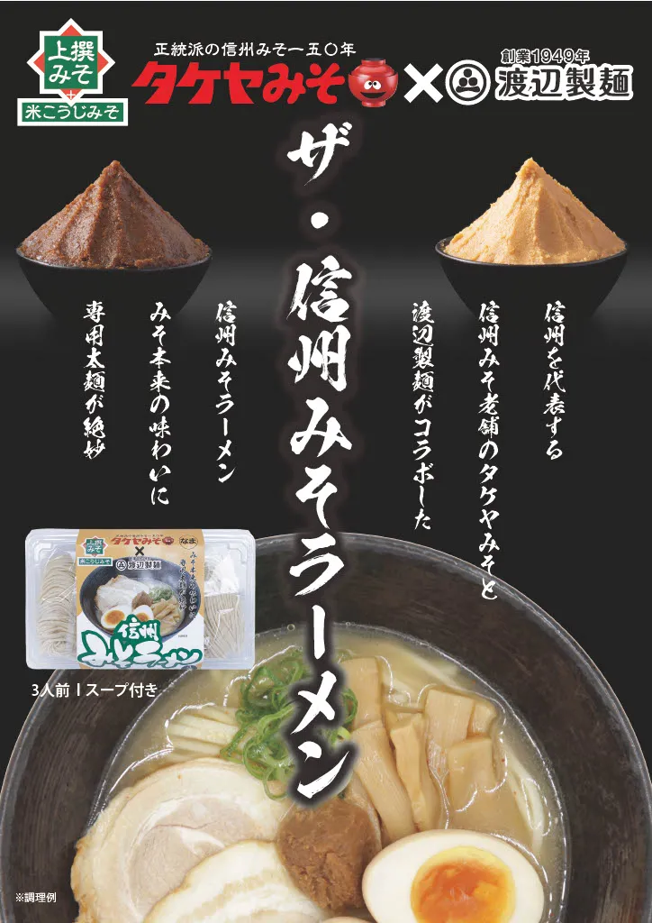 - 信州八ヶ岳山麓で創業半世紀の渡辺製麺と創業150年の信州タケヤみそとのコラボ商品です。